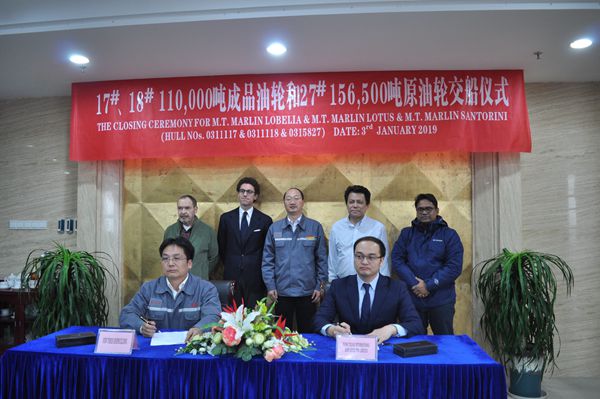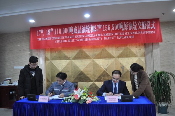 On January 3, 2019, the closing ceremony for No.17 & No.18 111,000 DWT Oil Tankers and No.27 156,500 DWT Crude Oil Tanker was held at the meeting room on 8th floor of New Times Office Building. Our CEO Mr. Liu Haijin, Executive General Manger Mr. Zhang Yuyong and the representatives from the Owner attended this ceremony. The delivery documents for these vessels were successfully signed by both parties.