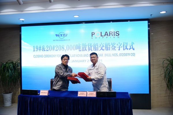 On January 21, 2021, the closing ceremony for No.19 and No.20 208,000 DWT Bulk Carriers was held at the meeting room on 8th floor of New Times Office Building. Our CEO Mr.Liu Haijin, Executive General Manger Mr. Zhang Yuyong and the representive from POLARIS SHIPPING CO.,LTD. Mr. Han Mingoo attended this ceremony. The vessels were smoothly and successfully delivered by us and accepted by POLARIS.