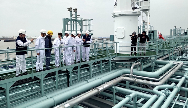 在劉海金總經理的陪同下,山東海運公司董事長于冰、總經理徐濤等一行嘉賓參觀了20#50000噸化學品船的甲板、機艙。站在新建的船舶上,看著嶄新的船舶設備設施和出航前船舶的運行狀態(tài),于冰董事長對給予了充分肯定和高度評價,并表示與新時代造船的精誠合作一定會讓雙方實現(xiàn)共贏目標。
